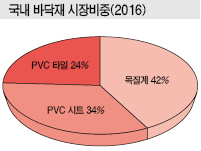 원료 강세에도 내수가격 10% 하락 … 수출은 고부가화 PVC(Polyvinyl Chloride) 바닥재 시장이 저가경쟁으로 고전하고 있다. 표, 그래프: <국내 바닥재 시장비중(2016)> <화학저널 2018년 4월 16일> |