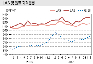 LAB는 벤젠 가격이 2017년 7월부터 상승한 영향으로 수출가격이 톤당 1100달러에서 12월 말 1300달러로 급등했으나 LAS 가격은 1000-1100달러에 머무르고 있다.