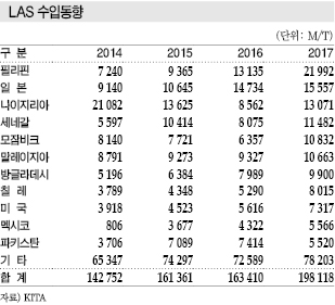 음이온 계면활성제 수출은 2014년 14만2752톤, 2015년 16만1361톤, 2016년 16만3410톤, 2017년 19만8118톤으로 신장세를 나타내고 있으며 2018년에는 20만톤을 넘어설 것으로 예상되고 있다.
