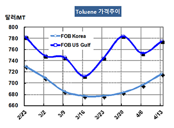 톨루엔(Toluene)은 700달러를 넘어섰다. 톨루엔 시세는 4월13일 FOB Korea 톤당 716달러로 20달러 상승했고 CFR SE Asia 역시 752달러로 18달러 올랐다. CFR Taiwan도 739달러로 20달러 상승했다. 표, 그래프: <Toluene 가격추이> <화학저널 2018/04/18> |