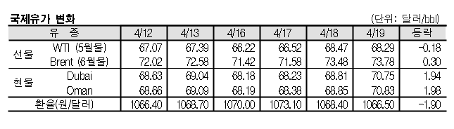 4월19일 국제유가는 브렌트유(Brent) 기준으로 OECD(경제협력개발기구)의 석유 재고 감소, 지정학적 리스크 리스크 증가 등으로 상승했다. 4월19일 국제유가는 OECD의 석유 재고가 감소한 영향으로 상승했다. 표, 그래프: <국제유가 변화> <화학저널 2018/04/20> |