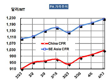 옥소알코올(Oxo Alcohol)은 일제히 상승했다. 2-EH(Ethylhexanol) 시세는 4월11일 CFR China 톤당 1155달러로 25달러 상승했고 CFR SE Asia도 1185달러로 25달러 올랐다. 표, 그래프: <PA 가격추이> <화학저널 2018/04/20> |