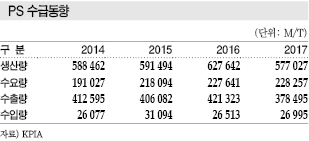 국내 PS 생산량은 2014년 58만8462톤, 2015년 59만1494톤, 2016년 62만7642톤으로 소폭 신장세를 유지했으나 LG화학이 생산능력을 5만톤 줄이면서 2017년 57만7027톤으로 감소했다.