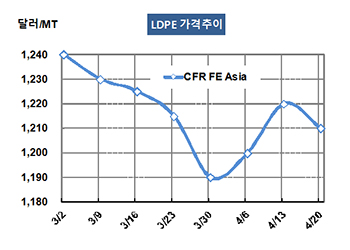 LDPE 시세는 4월18일 CFR FE Asia 톤당 1210달러로 10달러 하락했고 CFR SE Asia도 1230달러로 10달러 떨어졌다.
