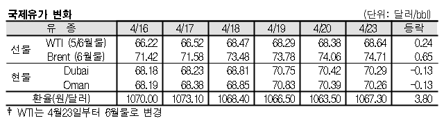 4월23일 국제유가는 이란 및 베네주엘라발 지정학적 리스크 확대, 예멘 반군의 사우디 석유 생산설비에 대한 미사일 발사 등으로 상승했다. 4월23일 국제유가는 이란 및 베네주엘라발 지정학적 리스크가 확산된 영향으로 상승했다. 표, 그래프: <국제유가 변화> <화학저널 2018/04/24> |