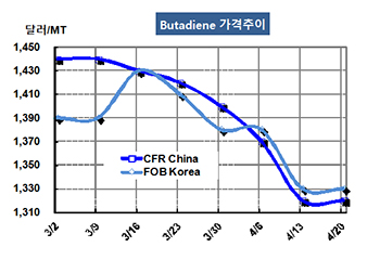 부타디엔(Butadiene)은 소강상태에 접어들었다. 부타디엔 시세는 4월20일 FOB Korea 톤당 1330달러로 보합세를 형성했고 CFR SE Asia 역시 1330달러로 변동이 없었다. CFR China도 1320달러로 보합세를 나타냈다. 표, 그래프: <Butadiene 가격추이> <화학저널 2018/04/24> |