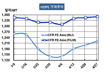 HDPE(High-Density Polyethylene)는 나홀로 강세를 계속했다. HDPE 시세는 4월25일 Injection 그레이드가 CFR FE Asia 톤당 1220달러로 20달러 상승했고 CFR SE Asia도 1280달러로 10달러 올랐다. Blow-Molding은 FEA가 1365달러로 5달러, SEA도 1385달러로 5달러 상승했다. 표, 그래프: <HDPE 가격추이> <화학저널 2018/04/30> |