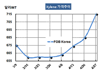 M-X(Mixed-Xylene)는 700달러를 넘어섰다. 솔벤트(Solvent) 그레이드 M-X 현물시세는 4월27일 FOB Korea 톤당 715달러로 30달러 급등했고 CFR SE Asia도 757달러로 22달러 상승했다. CFR China는 750달러로 35달러 급등했다. 표, 그래프: <Xylene 가격추이> <화학저널 2018/05/03> |