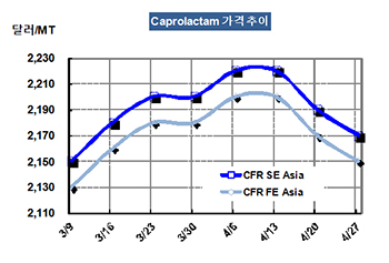 CPL(Caprolactam)은 하락압력이 가중되고 있다. CPL 시세는 4월25일 CFR FE Asia 톤당 2150달러로 20달러 하락했고 CFR SE Asia도 2170달러로 20달러 떨어졌다. 표, 그래프: <Caprolactam 가격추이> <화학저널 2018/05/03> |