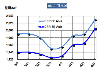 AN(Acrylonitrile)은 다시 2000달러를 넘어섰다. AN 시세는 4월25일 CFR FE Asia 톤당 2030달러로 40달러 상승했고 CFR SE Asia 역시 2005달러로 40달러 올랐다. CFR S Asia는 2010달러로 50달러 급등했다. 표, 그래프: <AN 가격추이> <화학저널 2018/05/03> |