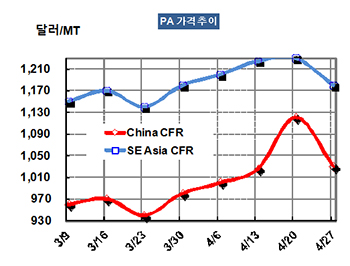 PA(Phthalic Anhydride)는 폭등과 폭락 행진을 거듭하고 있다. PA 시세는 4월25일 CFR China 톤당 1030달러로 90달러 폭락했고 CFR SE Asia 역시 1180달러로 50달러 급락했다. 표, 그래프: <PA 가격추이> <화학저널 2018/05/04> |