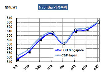 나프타(Naphtha)는 600달러대 중반으로 올라섰다. 나프타 시세는 4월27일 CFR Japan 톤당 631달러로 14달러 상승했으나 FOB Singapore은 631달러로 18달러 급등했다. CIF NWE는 635달러, FOB US Gulf는 641달러를 형성했다. 표, 그래프: <Naphtha 가격추이> <화학저널 2018/05/04> |