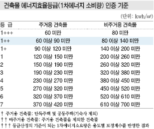 주거용 건축물의 연간 단위면적당 1차에너지 소요량이 평방미터당 60kWh 미만이면 1+++ 등급을 받을 수 있다.