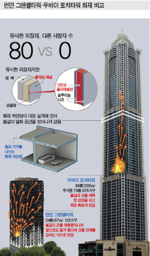 영국 그렌펠타워 화재와 두바이 토치타워 화재는 모두 비슷한 외장재로 마감했으나 그렌펠타워 화재는 80명이 사망하는 결과를 낳은 반면, 두바이타워는 방화구획 설계를 통해 불과 연기 확산을 최소화함으로써 인명 피해를 막은 것으로 판단되고 있다.