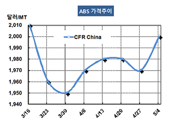 ABS(Acrylonitrile Butadiene Styrene)는 2000달러대로 올라섰다. ABS 시세는 5월2일 CFR China 톤당 2000달러로 30달러 상승했고 CFR SE Asia 역시 2010달러로 30달러 올랐다. 표, 그래프: <ABS 가격추이> <화학저널 2018/05/09> |