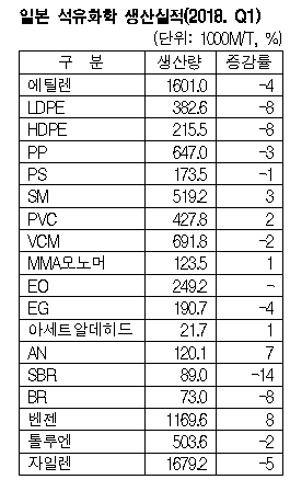표, 그래프: <일본 석유화학 생산실적(2018. Q1)>