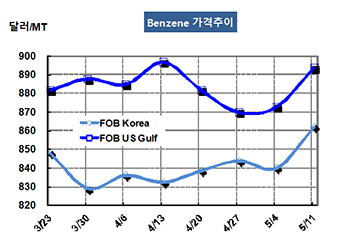 벤젠(Benzene)은 800달러대 후반으로 올라섰다. 벤젠 시세는 5월11일 FOB Korea 톤당 862달러로 22달러 상승했고 FOB SE Asia는 840달러로 22달러 올랐다. CFR Taiwan 역시 21달러 상승해 860달러를 형성했다. 표, 그래프: <Benzene 가격추이> <화학저널 2018/05/16> |