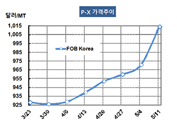 P-X(Para-Xylene)는 급등세로 돌변했다. P-X 시세는 5월11일 FOB Korea 톤당 1014달러로 43달러 급등했고 CFR SE Asia는 1023달러로 44달러 올랐다. CFR China 역시 43달러 급등해 1033달러를 형성했다. 표, 그래프: <P-X 가격추이> <화학저널 2018/05/17> |