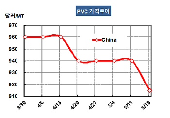 PVC(Polyvinyl Chloride)는 하락이 불가피했다. PVC 시세는 5월16일 CFR China 톤당 915달러로 25달러 하락했고 CFR SE Asia도 920달러로 20달러 떨어졌다. 특히, CFR India는 940달러로 40달러 폭락했다. 표, 그래프: <PVC 가격추이> <화학저널 2018/05/21> |
