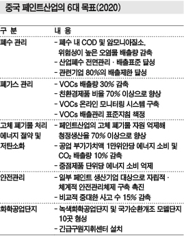 중국 페인트산업이 친환경 대책에 박차를 가하고 있다. 표, 그래프: <중국 페인트산업의 6대 목표(2020)> <화학저널 2018년 5월 28일> |