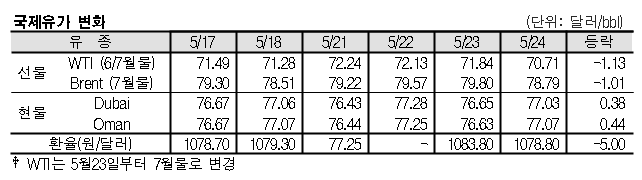 5월24일 국제유가는 OPEC(석유수출국기구) 등 산유국의 감산규모 축소 논의 계획, 북미 정상회담 취소에 따른 위험자산 투자심리 위축, 미국의 수입자동차 관세 부과 상향검토 등 무역분쟁 우려의 영향으로 하락했다.