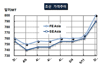 초산 시세는 5월18일 CFR FE Asia 800달러로 35달러 급등했고 CFR SE Asia 역시 790달러로 30달러 올랐다. CFR S Asia는 40달러 폭등해 760달러를 형성했다. 표, 그래프: <초산 가격추이> |