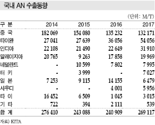 말레이지아 수출은 2014년 2만765톤, 2015년 9263톤, 2016년 1만7858톤, 2017년 1만9969톤으로 말레이지아가 신증설을 확대할 것으로 보여 AN 수요를 견인할 가능성이 제기되고 있다.
