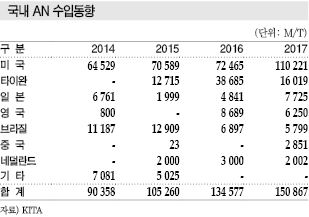 미국산 AN 수입은 2014년 6만4529톤, 2015년 7만589톤, 2016년 7만2465톤, 2017년 11만221톤으로 국내 수입시장의 73% 정도를 차지하고 있다.