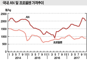 국내기업들은 AN-프로필렌 스프레드가 2014년 kg당 732원에서 2015년 595원, 2016년 474원으로 좁혀져 고전했으나 2017년 887원으로 크게 벌어짐으로써 호황을 만끽한 것으로 파악되고 있다.