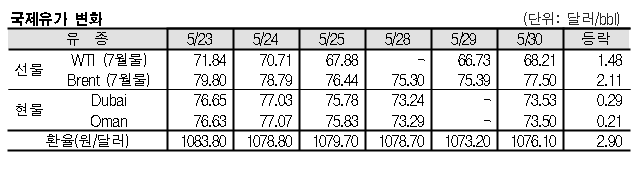 5월30일 국제유가는 인디아의 이란산 원유 수입 중단 계획, 러시아의 생산 확대 불참 가능성, 브라질의 석유 파업 개시, 미국 달러화 약세 등의 영향으로 상승했다. 5월30일 국제유가는 인디아가 이란산 원유 수입을 중단하는 방안을 검토함에 따라 상승했다. 표, 그래프: <국제유가 변화> <화학저널 2018/05/31> |