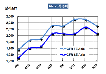 AN(Acrylonitrile)은 2000달러 초반으로 떨어졌다. AN 시세는 5월23일 CFR FE Asia 톤당 2030달러로 20달러 하락했고 CFR SE Asia도 2005달러로 20달러 떨어졌다. 표, 그래프: <AN 가격추이> <화학저널 2018/05/31> |