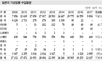 2017년 수출량 9094톤으로 45% 격감 … 탄산칼륨은 호조 계속 가성칼륨(Potassium Hydroxide)은 일본 수출이 대폭 줄어들었다. 표, 그래프: <일본의 가성칼륨 수입동향> <화학저널 2018년 6월 11일> |
