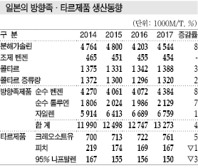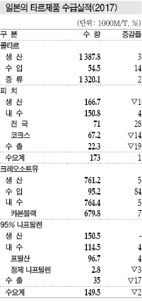 일본은 2017년 조강 생산량이 1억466만톤으로 전년수준을 유지했으나 콜타르는 138만7800톤으로 전년대비 3% 늘어났다. 증류랑은 132만100톤으로 2%, 수입은 5만4500톤으로 14% 증가했다.