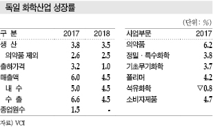 독일 화학공업협회(VCI)에 따르면, 독일은 2017년 화학제품 생산이 3.8% 증가하고 출하가격이 3.2% 상승해 매출액이 1958억유로로 6.0% 늘어난 것으로 파악되고 있다.
