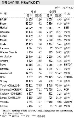 유럽 화학기업들은 2017년 전반적으로 호황을 누렸으며 비료 등 일부를 제외하고는 매출 및 수익이 대폭 증가했다.