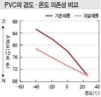 PVC는 온도가 낮아질수록 경화해 고무탄성이 저하되는 약점이 있어 자동차 옆유리 실링용은 주행 시 엘라스토머가 딱딱하게 굳어 윈드 노이즈가 발생하는 원인으로 작용했다.