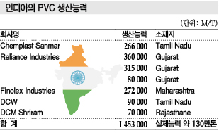 PVC 생산능력이 140만톤에 머무르고 있으며 Reliance, Finolex, Chemplast Sanmar 등 모두 인디아기업이 생산하고 있다.