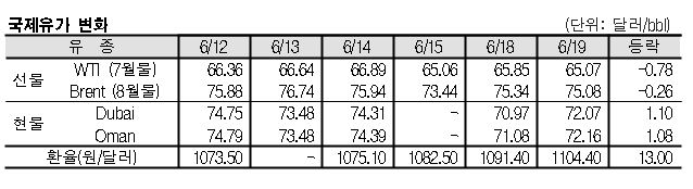 6월19일 국제유가는 미국과 중국의 무역분쟁 영향, 감산 참여국의 생산 확대 가능성, 미국 달러화 강세 등으로 하락했다.