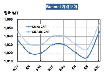NBA(N-Butanol)도 CFR China 톤당 1045달러로 30달러, CFR SE Asia 역시 1055달러로 30달러 상승했다.