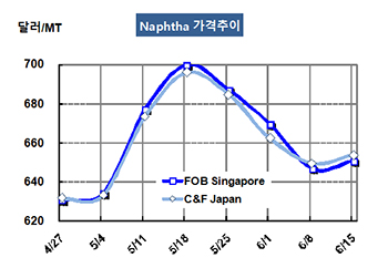 나프타(Naphtha)는 상승세로 전환됐다. 나프타 시세는 6월15일 CFR Japan 톤당 654달러로 5달러 상승했고 FOB Singapore 역시 651달러로 4달러 올랐다. CIF NWE는 635달러, FOB US Gulf는 630달러로 하락했다. 표, 그래프: <Naphtha 가격추이> <화학저널 2018/06/22> |