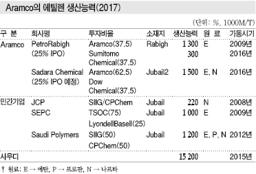 아람코(Saudi Aramco)는 2번의 석유위기를 계기로 1980년 사우디 정부가 국유화한 이후 원유 생산능력을 확대함으로써 글로벌 수급의 스윙 프로듀서로 OPEC(석유수출국기구) 위에 군림했으나 다운스트림은 수출용 석유제품 등으로 한정되고 석유화학 등 공업용은 원료·연료 공급에 머물렀다.
