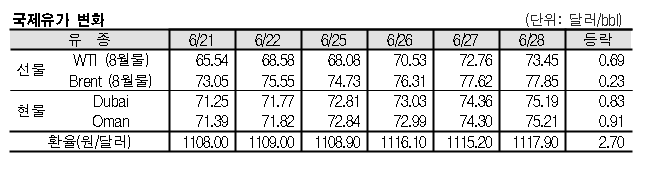 6월28일 국제유가는 미국의 이란산 원유 수입중단 요구, 미국 쿠싱지역 원유 재고 감소 등으로 상승했다. 6월28일 국제유가는 미국이 이란산 원유 수입중단을 요구한 영향으로 상승했다. 표, 그래프: <국제유가 변화> <화학저널 2018/06/29> |