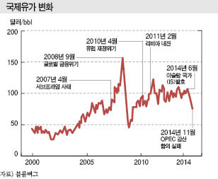 국제유가는 6월 초까지 브렌트유 기준 배럴당 77-78달러로 초강세 행진을 계속했으나 OPEC이 양분되면서 75달러 안팎으로 하락한재 등락을 거듭하고 있다.