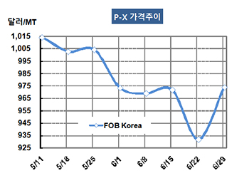P-X(Para-Xylene)는 급락에 대한 반발로 급등했다. P-X 시세는 6월29일 FOB Korea 톤당 974달러로 42달러 급등했고 CFR SE Asia도 980달러로 40달러 올랐다. CFR China 역시 42달러 급등해 993달러를 형성했다. 표, 그래프: <P-X 가격추이> <화학저널 2018/07/05> |