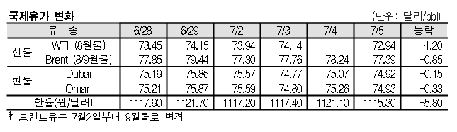 7월5일 국제유가는 미국의 원유 재고 증가, 아람코(Saudi Aramco)의 IPO(기업공개) 연기 전망 등으로 하락했다. 7월5일 국제유가는 미국의 원유 재고 증가 영향으로 하락했다. 표, 그래프: <국제유가 변화> <화학저널 2018/07/06> |