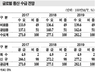 글로벌 황산 생산량은 2017년 2억7100만톤, 2018년 2억7710만톤, 2019년 2억8220만톤으로 확대될 것으로 예상되고 있다.
