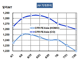 PP(Polypropylene)는 약세가 계속되고 있다. PP 시세는 7월18일 Raffia 및 Injection 그레이드가 CFR FE Asia 톤당 1220달러로 10달러 및 5달러 하락했고 CFR SE Asia 역시 1250달러 및 1240달러로 10달러 떨어졌다. IPP Film 및 BOPP는 FEA가 1245달러로 5달러, SEA는 1275달러 및 1280달러로 5달러 하락했다. Block Copolymer 역시 FEA는 1260달러로 5달러, SEA는 1290달러로 10달러 떨어졌다. 표, 그래프: <PP 가격추이> <화학저널 2018/07/24> |