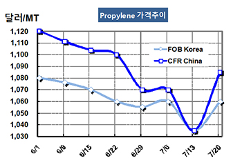 프로필렌(Propylene)은 갑자기 상승했다. 프로필렌 시세는 7월20일 FOB Korea 톤당 1060달러로 25달러 상승했고 CFR SE Asia도 995달러로 40달러 급등했다. CFR China는 40달러 급등해 1085달러를 형성했다. 표, 그래프: <Propylene 가격추이> <화학저널 2018/07/24> |