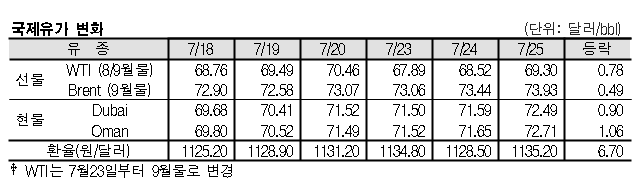 7월25일 국제유가는 미국의 원유 및 휘발유 재고 감소, 원유 수송로 Bab El-Mandeb 봉쇄, 미국 달러화 약세 등으로 상승했다. 7월25일 국제유가는 미국의 원유 및 휘발유 재고가 감소한 영향으로 상승했다. 표, 그래프: <국제유가 변화> <화학저널 2018/07/26> |