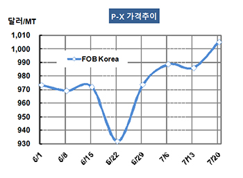 P-X(Para-Xylene)는 1000달러를 넘어섰다. P-X 시세는 7월20일 FOB Korea 톤당 1005달러로 19달러 상승했고 CFR SE Asia도 1005달러로 11달러 올랐다. CFR China는 11달러 상승해 1016달러를 형성했다. 표, 그래프: <P-X 가격추이> <화학저널 2018/07/26> |